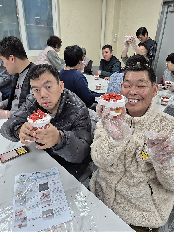 20251224_크리스마스파티&12월 이용자 생일 페이지 정보 작성자 예향 작성일26-01-20 17:30 조회457회 댓글0건 이전글 다음글 목록 본문 직업적응훈련 크리스마스파티 & 12월 이용자 생일 진행 하였습니다. 컵케익을 만드는 즐거움과 내가 만든 달콤한 케익을 맛보는 기쁨으로 크리스마스를 즐겼습니다~~^^ 댓글목록 등록된 댓글이 없습니다. 이전글 다음글 목록